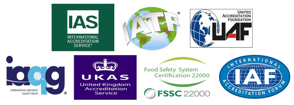 ECSSB audit and issue internationally accredited IAS USA, UAF USA, NAC USA, UKAS UK, DSM Malaysia, SCC Canada, DAKKS Germany, IATF, AIQG certification against the following popular standards via IAF approved accredited certification body.